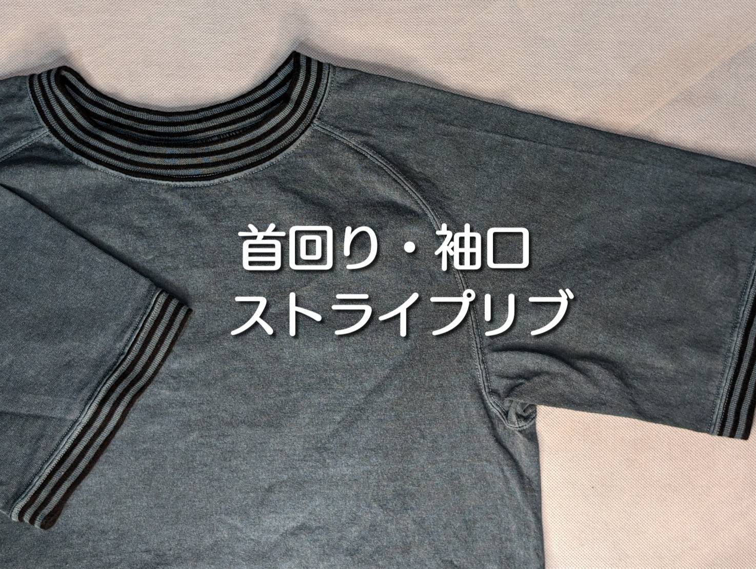 ピグメント加工したヴィンテージ感たっぷりな風合い漂うブルーグレーカラーに、襟口と袖口にブラックのストライプリブ。落ち着いたトーンがアクセントカラーになっています。